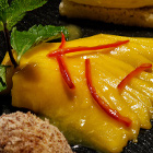 Grießknödel mit Nougatfüllung an scharfer Mango mit weißer Schokoladenmousse auf leichtem Biskuit